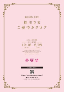 01 Group Company 注 意 事 項 ■お申込みについて ・お申込み受付期間につきましては 開始:2019年12月16日(月)【WEB・電話10:00~】 終了:2020年2月28日(金)【WEB~23:59・電話~18:00】 ※2019年12月28日~2020年1月5日は電話でのご注文は受 け付けておりません。 ・お申込み方法はWEBサイトからのお申込みと、お電話でのお申 込みとなります。 ・商品につきましては、先着順となりますので、ご希望に添えない場 合があります。予めご了承いただけますようお願いいたします。 ■商品発送について ・お申込みいただきました商品は2020年1月下旬より順次発送と なります。 ・複数商品をお申込みの場合、すべての商品が揃った時点での発 送となります。(発送予定日が一番遅い商品に合わせての発送に なります。) ・お申込みが殺到した場合、やむを得ず発送が遅れてしまう可能性 がございます。詳細はWEBサイトにてご案内させていただきます ので、ご確認ください。 ・配送会社の指定および配送日時のご指定は承っておりませんの で、予めご了承いただけますようお願いいたします。 ・お申込みはご本人様に限りますが、お届け先住所は変更可能で す。大切な方へのプレゼントにもご利用ください。(ギフトラッピン グはおこなえません。) ・お申込み単位の梱包・発送になりますが、同じ株主様で、同日同 住所へのお申込みは同梱でお送りする場合がごさいます。また、 数量が多い場合は、複数個口に分かれて発送になる場合がござ います。 ・優待券(割引券含む)、ECクーポンにつきましては金券としてのお 取り扱いとなりますので、通常商品とは別途お送りさせていただ きます。 ・その他一部「別送」の記述がある商品につきましては、別途お送り させていただく場合がございます。(水、優待券等) ■その他 ・各優待券につきましては、ご本人様のみの使用が可能となりま す。使用有効期限・規約につきましては、チケット毎に異なります ので、チケットページにてご確認ください。 ・食品など一部商品につきましては、賞味期限がございますのでご 確認ください。 ・お申込み後のお客様のご都合による商品の交換・返品はいたしか ねます。 200株以上 6,000ポイント 400株以上 12,000ポイント 100株以上 4,000ポイント 800株以上 24,000ポイント 1,200株以上 30,000ポイント 2,000株以上 36,000ポイント 所有株式数別付与ポイント数 02 お申込み手順 お申込みはカンタン! 4Step STEP 1 商品を選ぶ 商品ページをご覧頂き、ご希望の商品をお選 びください。 STEP 2 商品番号を確認 ご希望の商品を見つけたら、アルファベット3 文字、数字4桁の商品番号をお控えください。 商品番号は商品名の上に記載しております。 STEP 3 WEBでお申込み STEP2でお控え頂いた商品番号を株主優待 サイトで検索。任意のお届け先を設定してお 申込みいただけます。 STEP 4 商品のお受け取り お申込み受付後、2020年1月下旬以降より 順次ご指定いただいたご住所へお届けする予 定です。 RZG1234 お申込みはこちらから! 詳しいご注文方法は 次のページ を ご覧ください。 お申込みはお電話でも受け付けております。 スマホも OK! ご 優 待 お 申 込 みサイト https://sr.rizapgroup.com/ お申込み専用ダイヤル 【受付開始 2019年12月16日(月)~2020年2月28日(金)】 7 0120-941-602 (ご優待カタログ掲載分) 受付時間:10:00~18:00(土日祝日を除く) ※WEB・電話の受付は同日開始となります。 ※商品は2020年1月下旬より順次発送となります。 ※2019年12月28日~2020年1月5日は電話でのご注文は受け付けておりません。 7 0120-941-506 受付時間:10:00~18:00(土日祝日を除く) yutai@dreamv.co.jp お問い合わせ